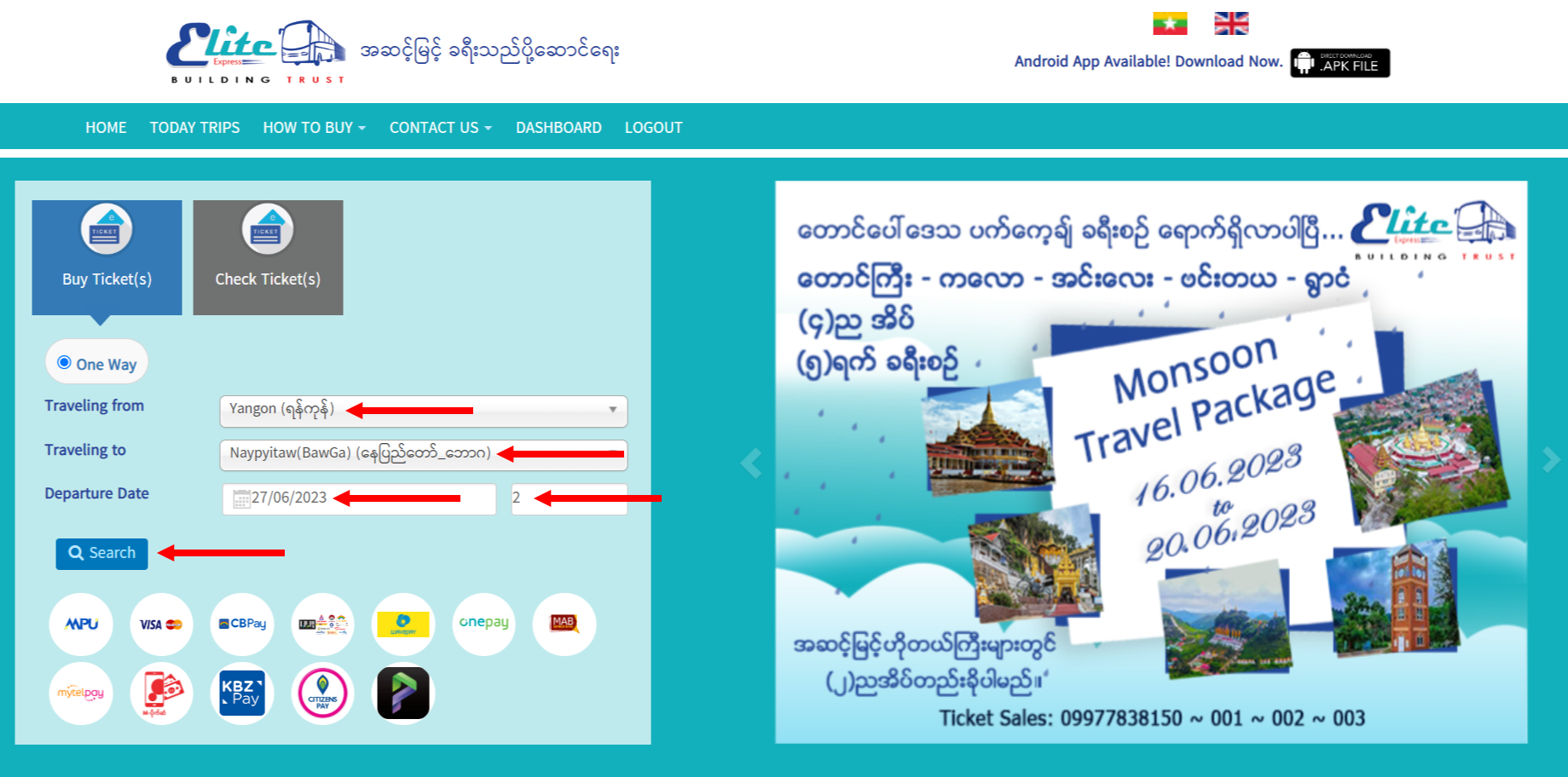 ၁။ လိုအပ်သော ခရီးစဉ် အချက်လက်များ ရွေးချယ်ဖြည့်သွင်းပြီး Search ကို နှိပ်ပါ။