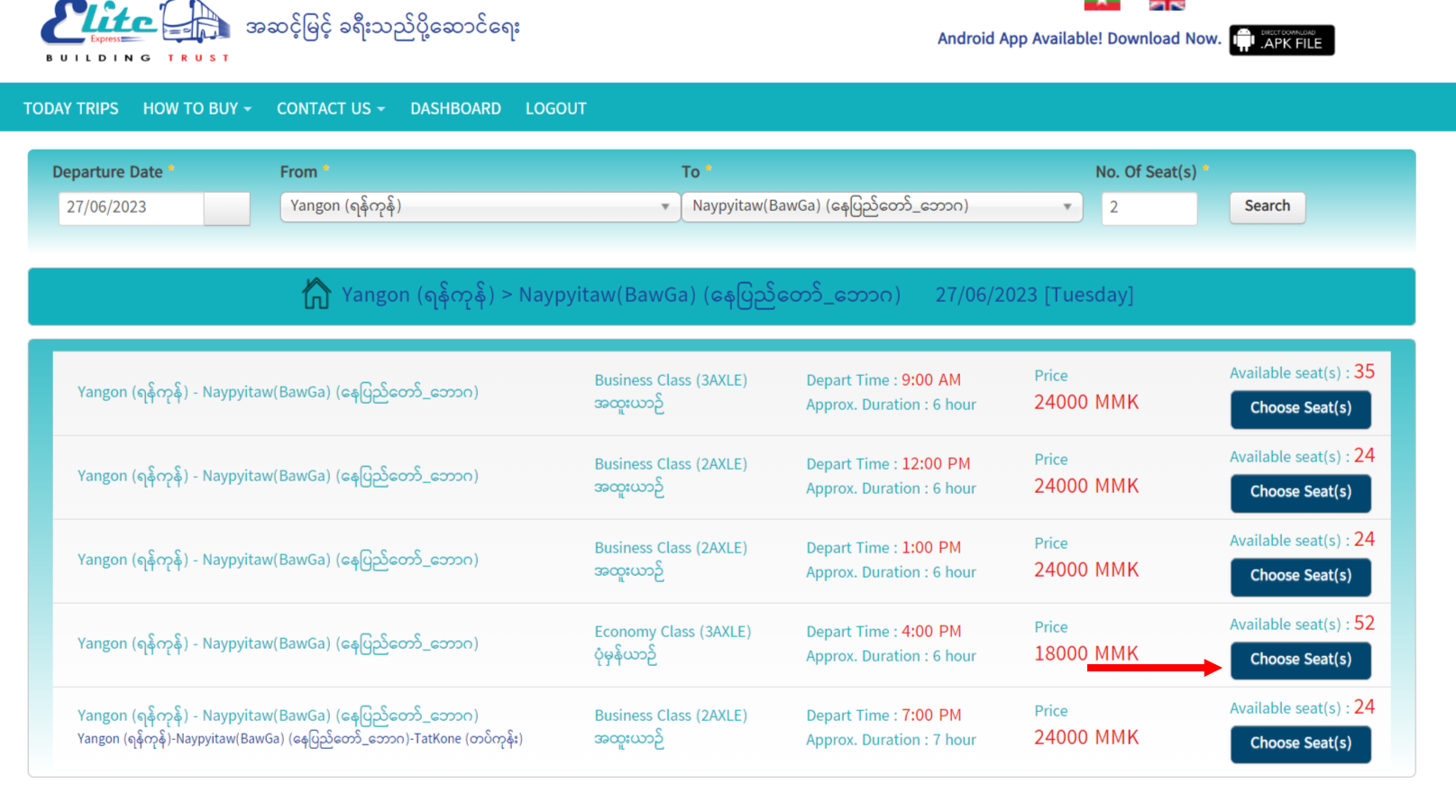 ၂။ လက်မှတ်ဝယ်ယူရန် မိမိသွားရောက်လိုသော ခရီးစဉ်အချိန်ကို ရွေးချယ်ပြီး Choose Seat(s) ကို နှိပ်ပါ။