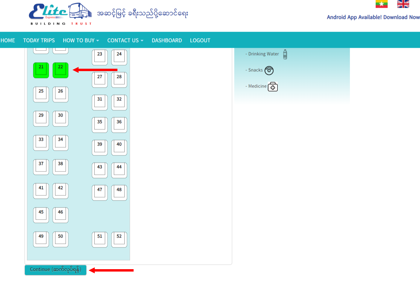 ၃။ ဝယ်ယူနိုင်သော အဖြူရောင်ခုံများမှ မိမိကြိုက်နှစ်သက်ရာ ခုံကိုနှိပ်ပြီး Continue ကိုနှိပ်ပါ။