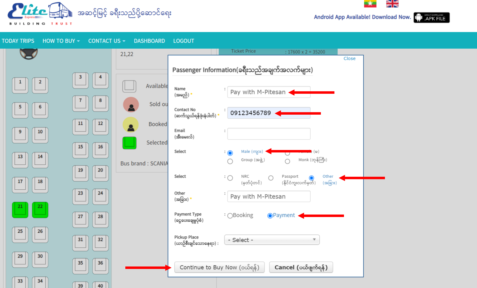 ၄။ ခရီးသည် အချက်အလက်များဖောင်တွင် လိုအပ်သော အချက်အလက်များကို ဖြည့်သွင်းပြီး ငွေပေးချေမှုပုံစံတွင် Payment ကို ရွေးချယ်ပေးရပါမည်။ email သို့ လက်မှတ် ပို့စေလိုပါက မှန်ကန်သော email ကို ဖြည့်သွင်းပါ။ ထိုနောက် Continue to Buy Now ကို နှိပ်ပါ။