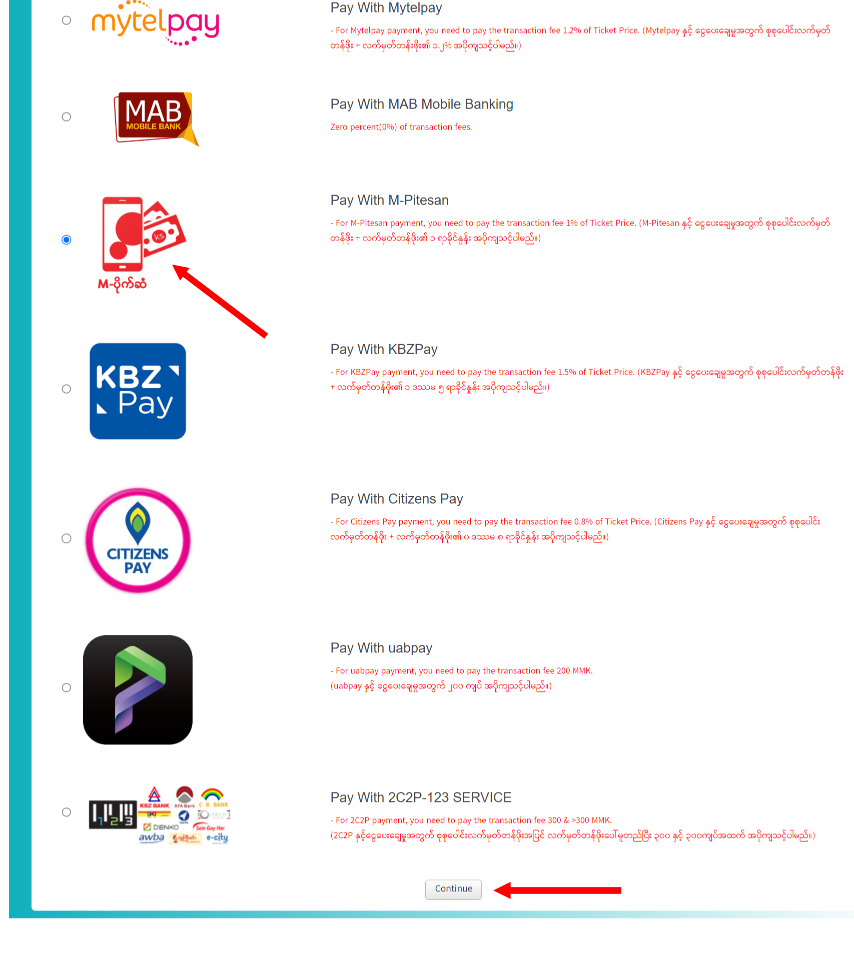 ၅။ M-Pitesan အားရွေးချယ်၍ click နှိပ်ပေးပြီး "Continue" အား ထပ်မံနှိပ်ပေးပါ။