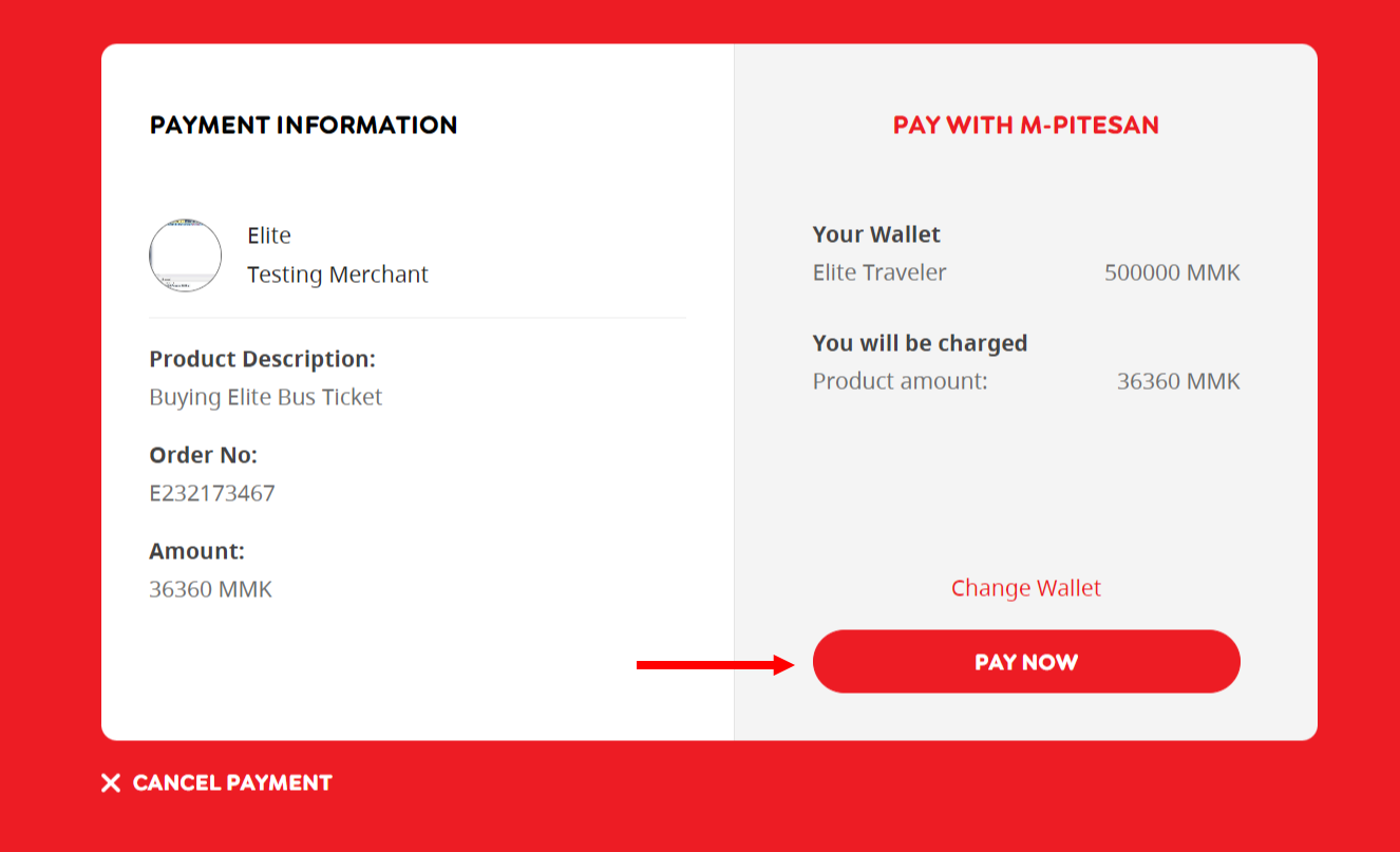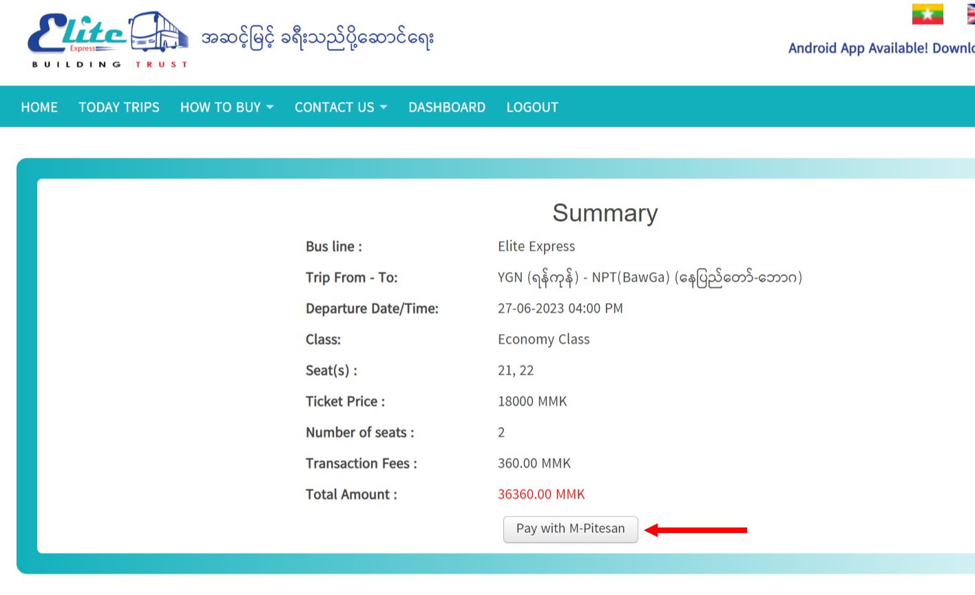 ၆။ မိမိထည့်သွင်းခဲ့သော အချက်လက် အကျဉ်းချုပ်အား ထပ်မံစစ်ဆေးပြီးနောက် "Pay With M-Pitesan" ကို နှိပ်ပေးပါ။