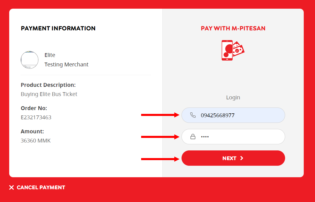 ၇။ မိမိ M-Pitesan account ပြုလုပ်ခဲ့စဉ်က ရရှိထားသော User ID နှင့် PIN number အား ထည့်သွင်းပေးပြီး Submit နှိပ်ပေးပါ။ ထို့နောက် PAY NOW အား ထပ်မံ နှိပ်ပေးပါ။