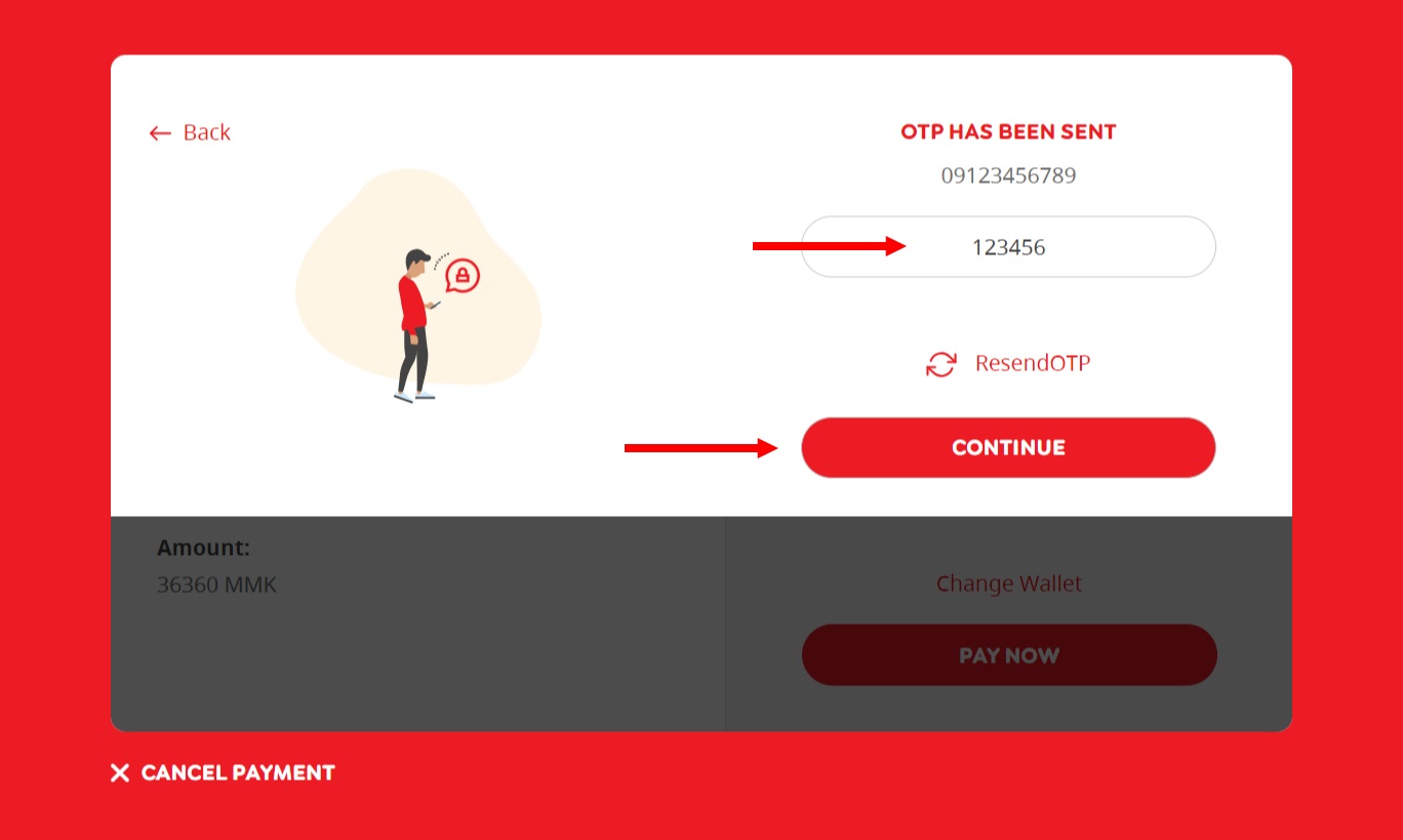 ၈။ ထို့နောက် M-Pitesan မှ သင် Account မှတ်ပုံတင်စဉ်က အသုံးပြုခဲ့သော ဖုန်းနံပါတ်သို့ ဂဏန်း ၆ လုံးပါ OTP code တစ်ခုပေးပို့မည်ဖြစ်ပြီး ထို code အား အသုံးပြုပြီးနောက် CONTINUE အား နှိပ်ပေးပါ။