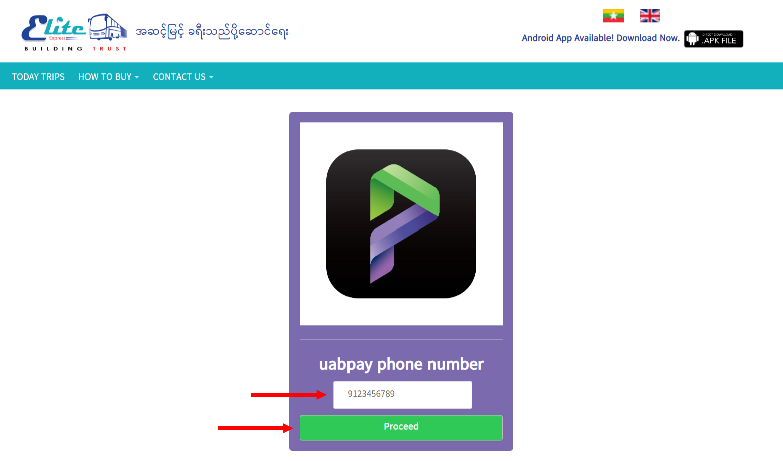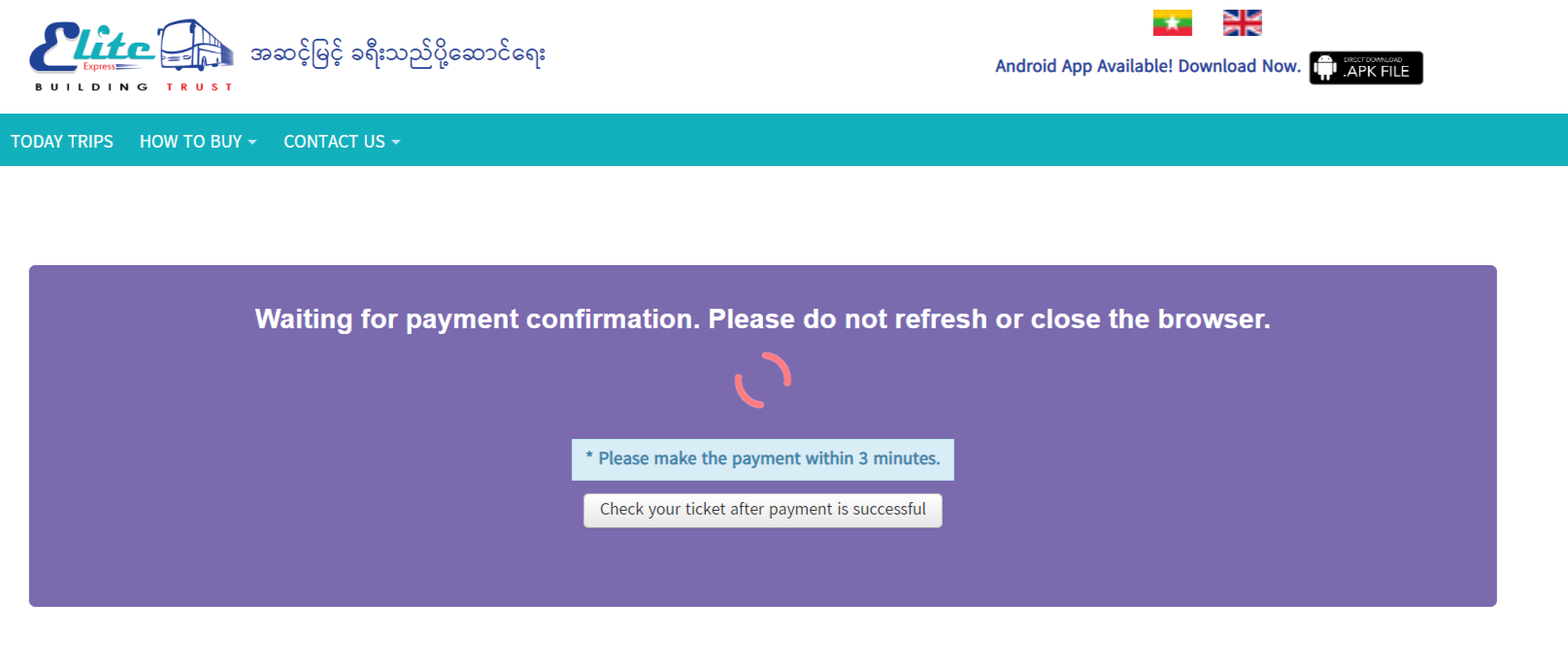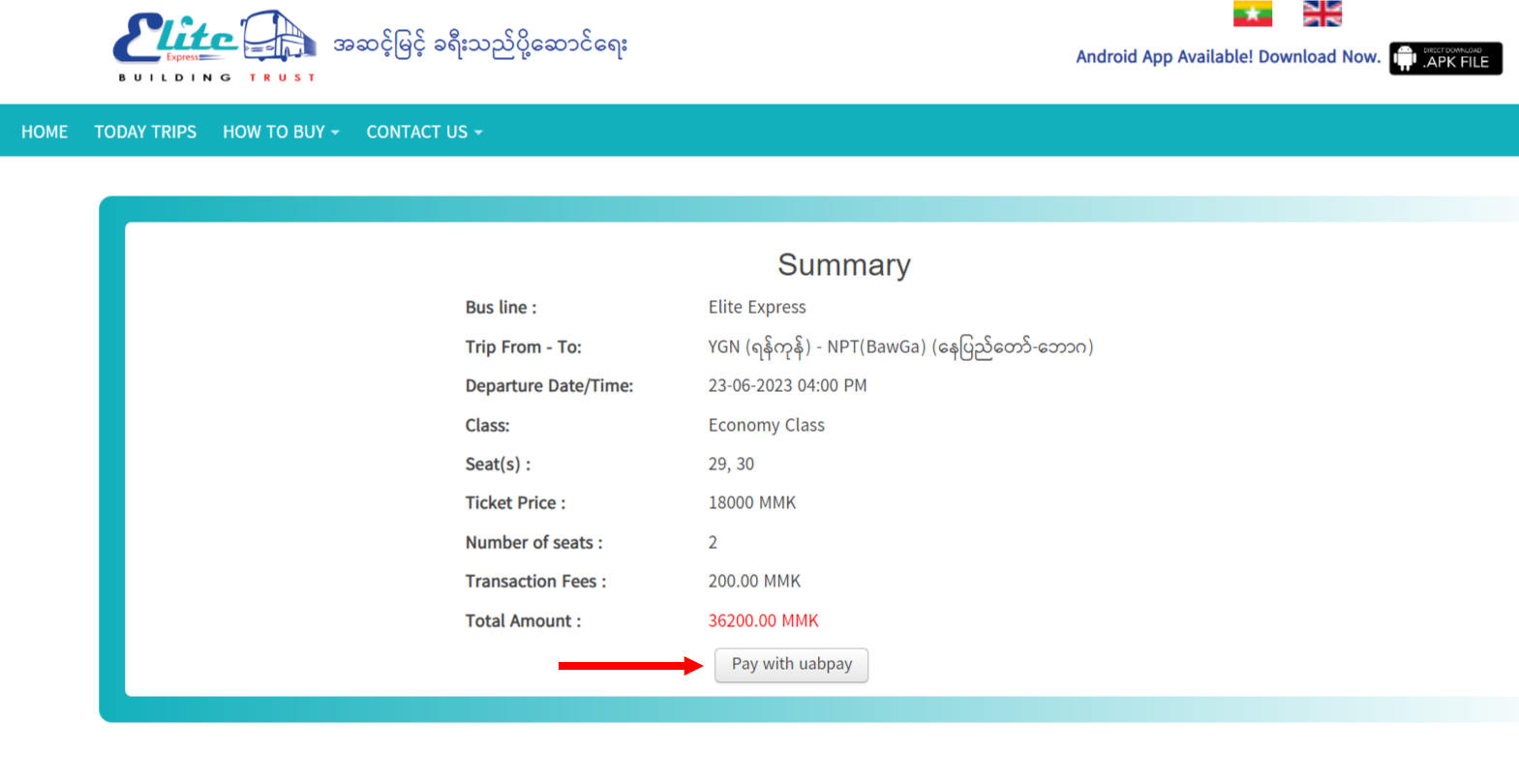 အထက်ပါ အဆင့်များသည် Elite Express Website မှတစ်ဆင့် ဝယ်ယူသူများအတွက်သာ ရည်ရွယ်ပါသည်။ Website အား အသုံးမပြုပဲ uabpay application မှလည်း Elite ကားလက်မှတ်များအား တိုက်ရိုက် ဝယ်ယူရရှိနိုင်ပါသည်။