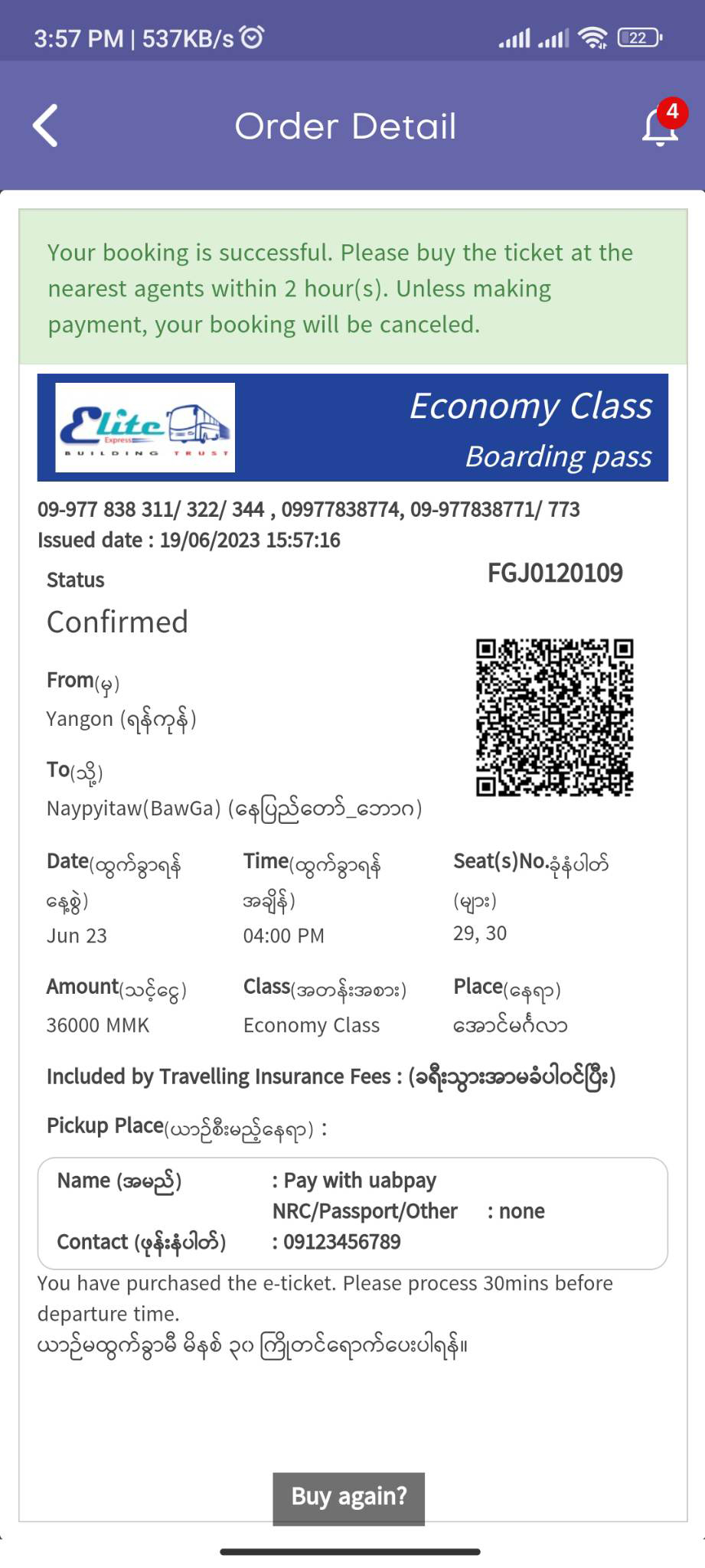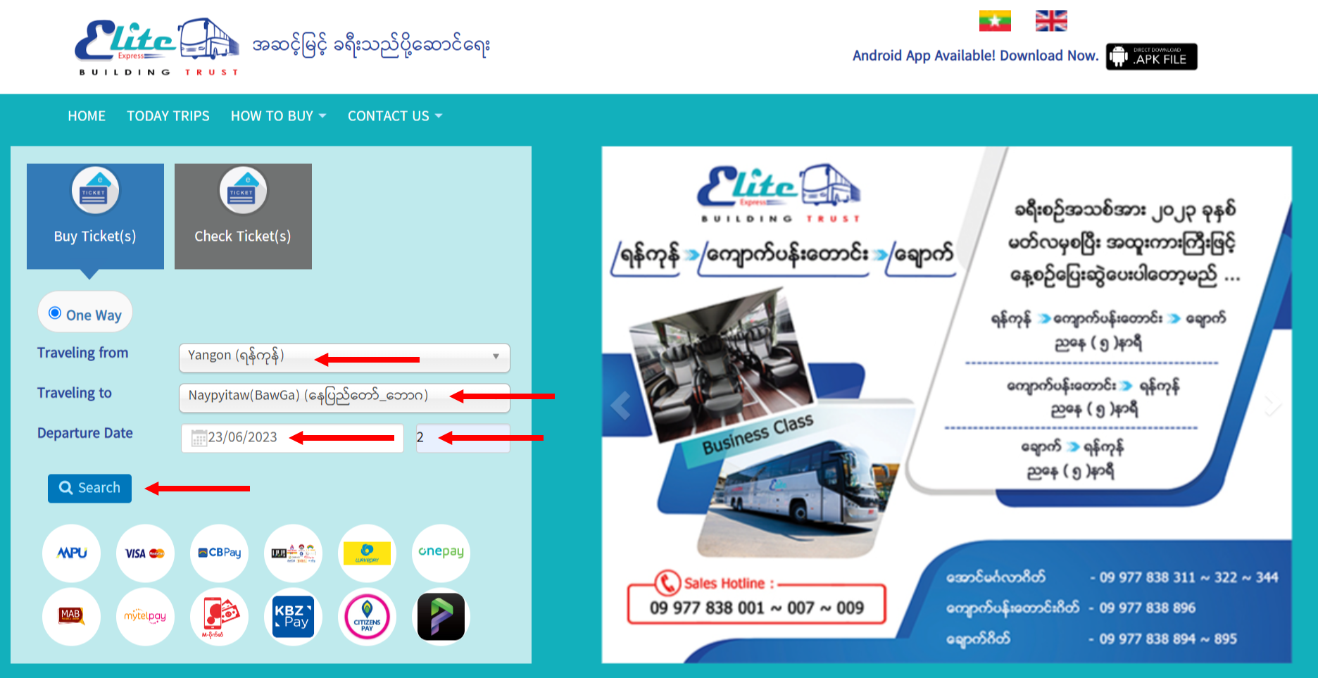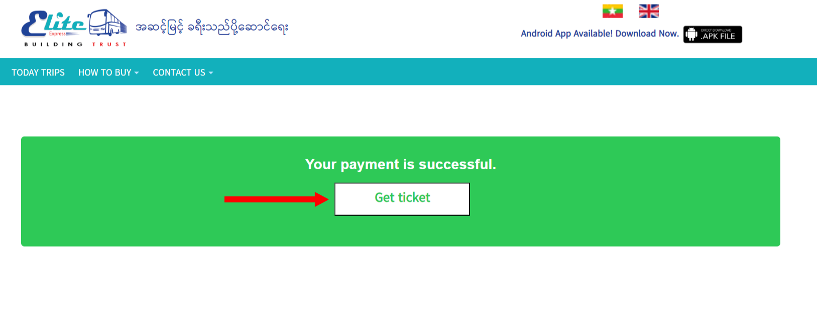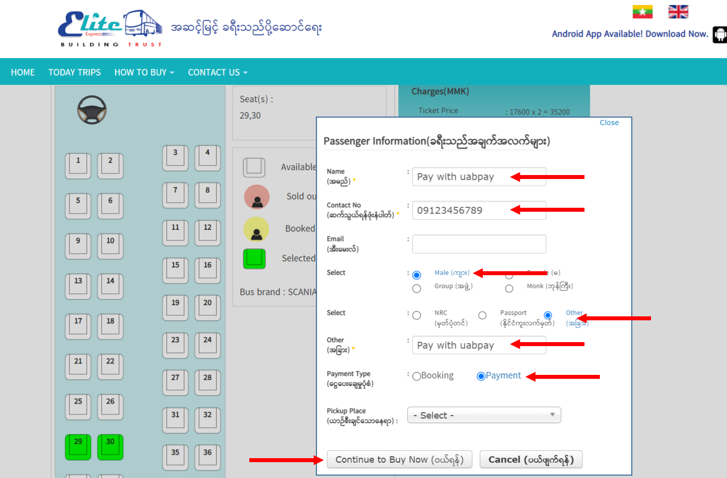 အထက်ပါ အဆင့်များသည် Elite Express Website မှတစ်ဆင့် ဝယ်ယူသူများအတွက်သာ ရည်ရွယ်ပါသည်။ Website အား အသုံးမပြုပဲ uabpay application မှလည်း Elite ကားလက်မှတ်များအား တိုက်ရိုက် ဝယ်ယူရရှိနိုင်ပါသည်။