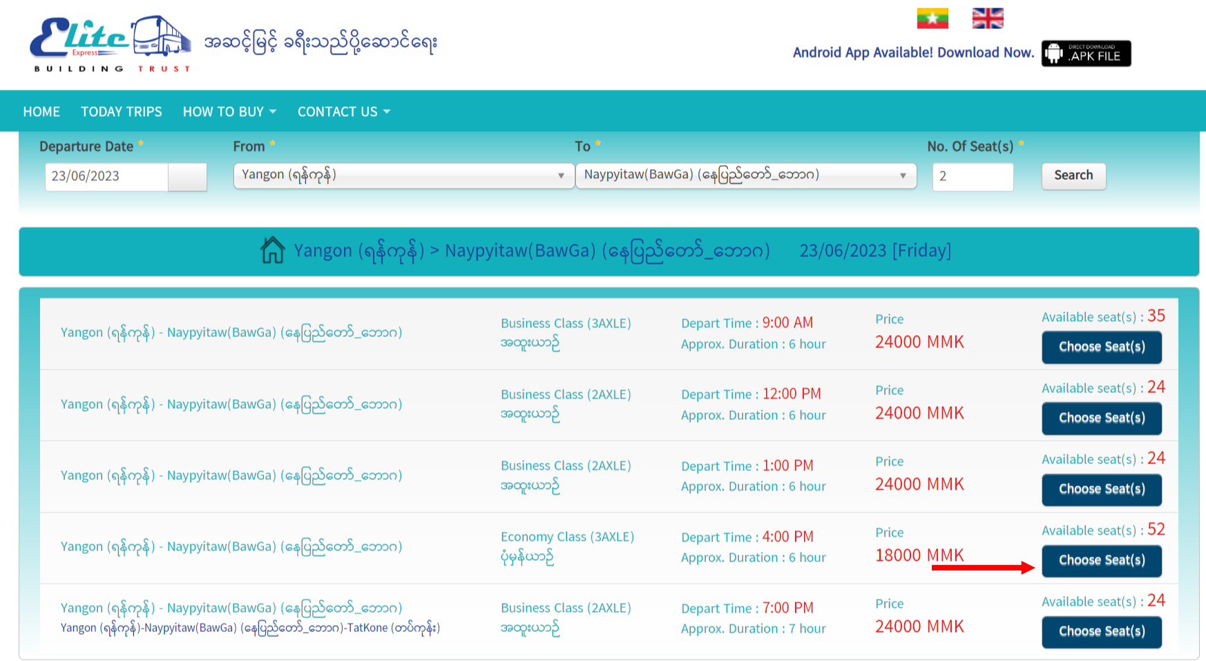 ၂။ လက်မှတ်ဝယ်ယူရန် မိမိသွားရောက်လိုသော ခရီးစဉ်အချိန်ကို ရွေးချယ်ပြီး Choose Seat(s) ကို နှိပ်ပါ။