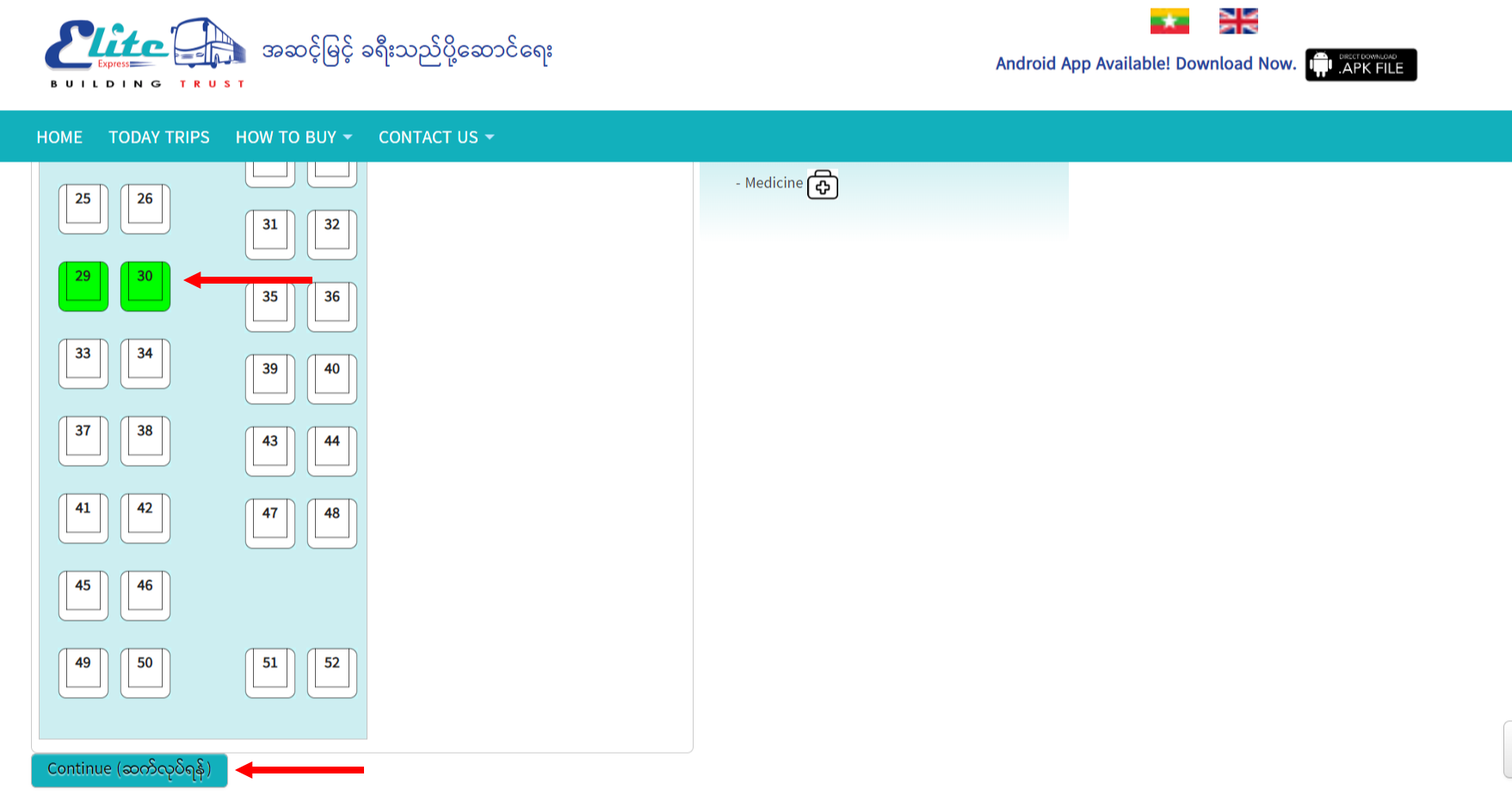 ၃။ ဝယ်ယူနိုင်သော အဖြူရောင်ခုံများမှ မိမိကြိုက်နှစ်သက်ရာ ခုံကိုနှိပ်ပြီး Continue ကိုနှိပ်ပါ။