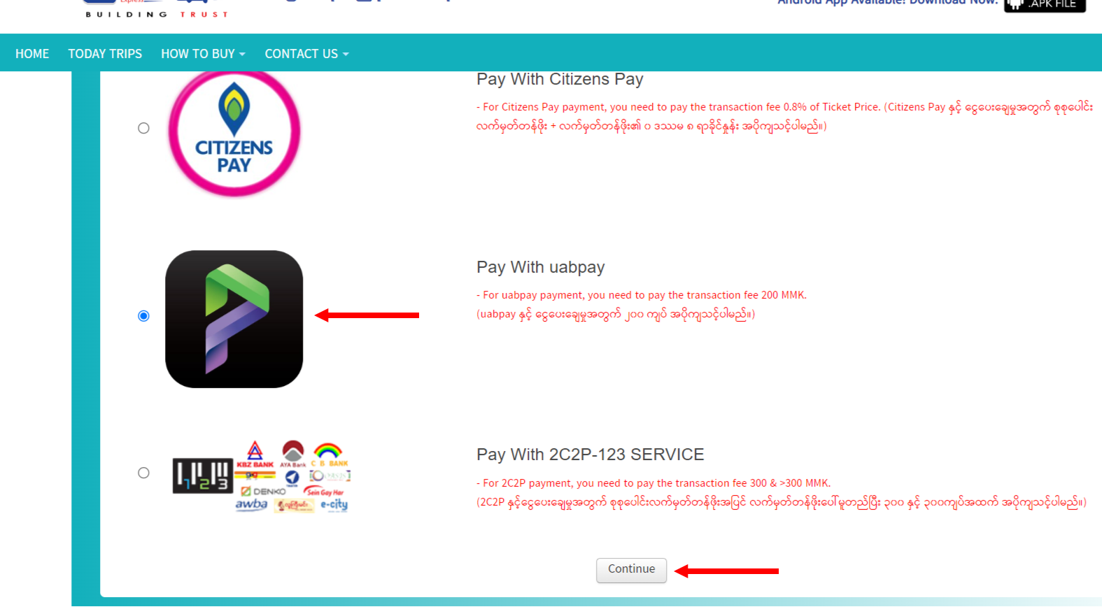 ၅။ uabpay အားရွေးချယ်၍ click နှိပ်ပေးပြီး "Continue" အား ထပ်မံနှိပ်ပေးပါ။