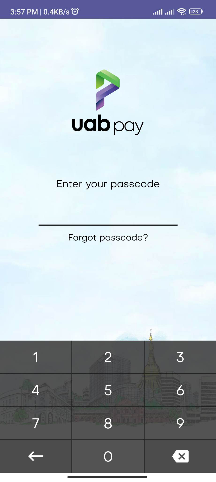 ၈.၃ | တတိယအဆင့် အနေဖြင့် အောက်ပါပုံတွင် ဖော်ပြထားသကဲ့သို့ မိမိ uabpay အကောင့်၏ Passcode အား တောင်းခံမည်ဖြစ်ပြီး Passcode ၆ လုံးအား ရိုက်ထည့်ပေးပါ။